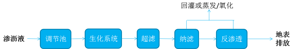 為響應(yīng)《生活垃圾填埋場(chǎng)污染控制標(biāo)準(zhǔn)》(GB 16889-2008)中垃圾滲濾液污染物排放限值的相關(guān)要求,按照《生活垃圾填埋場(chǎng)滲濾液處理工程技術(shù)規(guī)范(試行)》(HJ 564-2010)和《生活垃圾滲瀝液處理技術(shù)規(guī)范》(CJJ 150-2010),目前預(yù)處理+生物處理+膜處理的處理工藝(見圖3)是我國(guó)滲濾液處理的主流組合工藝。