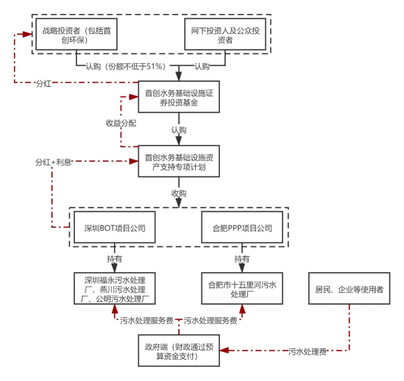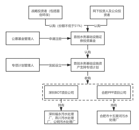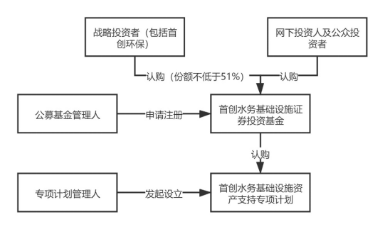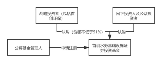 具體實施步驟為:首先,公募基金管理人富國基金向證監(jiān)會申請注冊首創(chuàng)水務(wù)基礎(chǔ)設(shè)施證券投資基金,取得注冊文件后,富國基金將基礎(chǔ)設(shè)施證券投資基金進(jìn)行公開發(fā)售,其中首創(chuàng)環(huán)?;蚱渫豢刂葡玛P(guān)聯(lián)方作為戰(zhàn)略配售投資人參與認(rèn)購比例不低于本次基金份額發(fā)售數(shù)量的51%(實際發(fā)行時認(rèn)購比例為51%)。