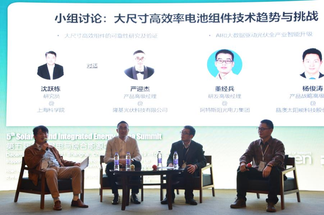 下午的小組討論主題為:大尺寸高效率電池組件技術趨勢與挑戰(zhàn),該討論由上??茖W院研究員沈躍棟主持,隆基光伏科技有限公司產品高級經理嚴迎杰、阿特斯陽光電力集團研發(fā)高級經理董經兵、晶澳太陽能科技股份有限公司產品戰(zhàn)略高級經理楊俊濤積極參與了討論。嘉賓們圍繞大尺寸高效組件的可靠性研究及驗證、AI和大數據驅動光伏全產業(yè)智能升級等話題展開了交流和探討。臺上臺下積極互動,將第一天的會議推向了高潮。