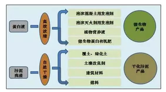 污泥經(jīng)水解處理后,其含蛋白液體經(jīng)濃縮后可作為蛋白發(fā)泡劑和有機肥等利用,污泥殘渣可用做覆土、綠化土、土壤改良劑和建筑材料等。