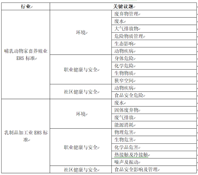 在聯(lián)合國可持續(xù)發(fā)展目標(biāo)及各個國際組織出臺的可持續(xù)議題基礎(chǔ)之上,目前國際上也形成了行業(yè)導(dǎo)向的可持續(xù)發(fā)展標(biāo)準(zhǔn)。其中,由世界銀行集團(tuán)國際金融公司制定的《環(huán)境、健康與安全指南(EHS)》中就有針對乳制品行業(yè)的養(yǎng)殖端與加工端,在充分考慮行業(yè)特色的基礎(chǔ)上分別形成了兩套指標(biāo),《哺乳動物家畜養(yǎng)殖業(yè)環(huán)境、健康與安全指南》與《乳制品加工業(yè)環(huán)境、健康與安全指南》,重點關(guān)注行業(yè)在環(huán)境、職業(yè)健康與安全、社區(qū)健康與安全三大領(lǐng)域下的可持續(xù)發(fā)展。對于乳制品行業(yè)的養(yǎng)殖端來說,應(yīng)重點關(guān)注環(huán)境層面的表現(xiàn),包括養(yǎng)殖過程中的廢棄物、廢水處理、溫室氣體排放情況、潛在生態(tài)影響、動物疾病等方面;對于加工端來說,應(yīng)重點關(guān)注加工制造過程中的能耗情況、廢氣排放情況、固體廢棄物處理,以及生產(chǎn)安全情況等方面。