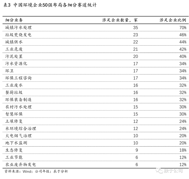 更細(xì)分去看,城鎮(zhèn)污水處理、垃圾焚燒發(fā)電、城鎮(zhèn)供水、工業(yè)危廢等是中國環(huán)境企業(yè)50強(qiáng)布局最多的細(xì)分領(lǐng)域(見表3),這些領(lǐng)域基本都是規(guī)模上千億甚至數(shù)千億的市場(chǎng),“盤子”足夠大,商業(yè)模式穩(wěn)定,是環(huán)境強(qiáng)企必爭(zhēng)之地。