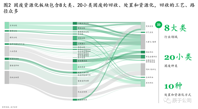 固廢資源化板塊包含8大類、20小類固廢的回收、處置和資源化,回收的工藝、路徑眾多(見圖2),除此之外還包含環(huán)衛(wèi)等服務(wù)領(lǐng)域,最大的特點(diǎn)就是規(guī)模大——當(dāng)前的總市場(chǎng)規(guī)模超過2萬億,足夠容納20個(gè)千億級(jí)環(huán)保企業(yè),而且“十四五”期間預(yù)計(jì)還將保持8%~10%的年復(fù)合增長率。