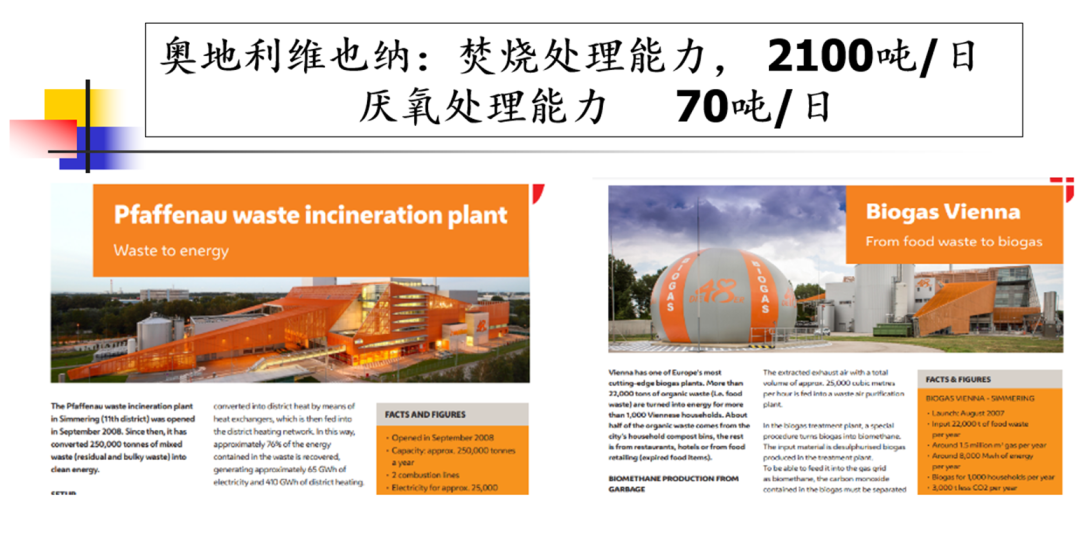 上圖是奧地利維也納的一個垃圾焚燒發(fā)電廠??梢钥吹皆摲贌龔S的一端有一個厭氧消化裝置,這個厭氧裝置主要處理從家庭分出來的廚余垃圾。我國的垃圾焚燒發(fā)電廠都有滲濾液處理裝置,且配置的比例遠遠大于圖中焚燒發(fā)電廠。圖中焚燒發(fā)電廠的焚燒能力是2100噸/日,其對應的厭氧處理能力僅是70噸/日。而國內(nèi)2100噸/日的垃圾焚燒發(fā)電廠配的厭氧規(guī)模以垃圾處理規(guī)模的20%計也超過400噸/日。