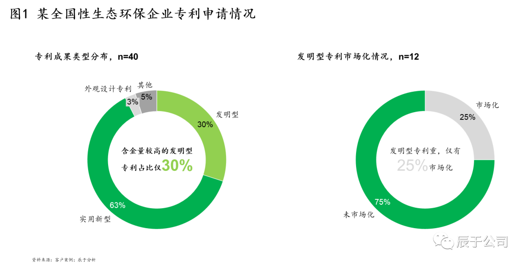 以我們服務(wù)過的某全國性生態(tài)環(huán)保企業(yè)為例,盡管營業(yè)收入已近70億元,但當(dāng)年的研發(fā)投入不足1000萬元,專利申請數(shù)區(qū)區(qū)40件,且63%的為實(shí)用新型專利,含金量較高的發(fā)明型專利僅占30%,其中又只有25%的進(jìn)行了商業(yè)應(yīng)用(見圖1)。