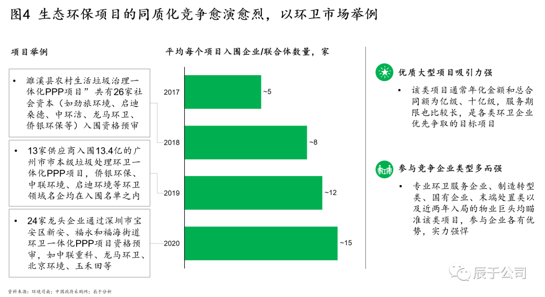 這樣帶來的直接后果就是同質(zhì)化競爭愈演愈烈,價(jià)格戰(zhàn)時(shí)有發(fā)生,不僅影響企業(yè)的盈利水平,也對后期的運(yùn)營帶來隱患。由于缺乏有門檻的技術(shù)壁壘,一些環(huán)保項(xiàng)目的招標(biāo)活動動輒十幾家甚至數(shù)十家企業(yè)參加(見圖4),而針對一些技術(shù)難度大的項(xiàng)目,要么無人問津不敢接手,要么接手了之后最終陷于無計(jì)可施的尷尬境地。