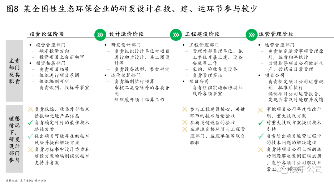 國內(nèi)生態(tài)環(huán)保企業(yè)“重投建、輕技運(yùn)”的問題由來已久,由于沒有將研發(fā)設(shè)計(jì)放在一個(gè)正確的位置與高度,導(dǎo)致總部-事業(yè)部-項(xiàng)目公司的研發(fā)設(shè)計(jì)定位不清,該總部牽頭做的沒人做,該項(xiàng)目公司負(fù)責(zé)的,由于目的明確、相對簡單,各級主體“搶著做”,原本有限的技術(shù)資源散亂在內(nèi)部的各個(gè)層級和角落,沒有形成各司其職、各盡其責(zé)、上下一致的合力。