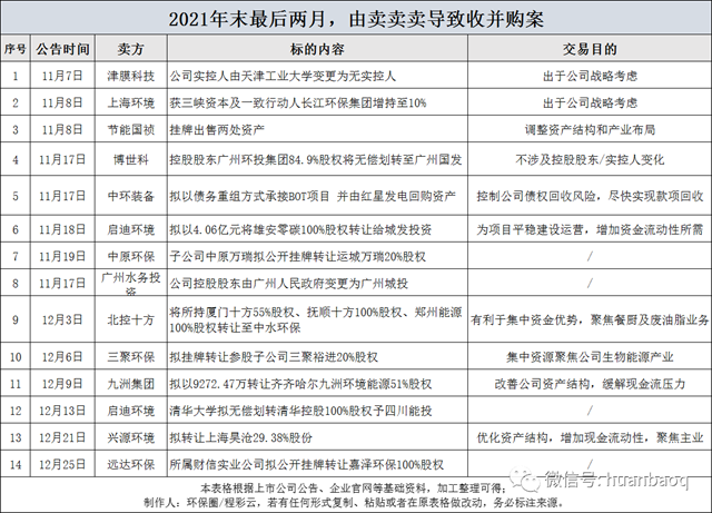 但更多的是,不少我們熟知的上市環(huán)企為了降低負(fù)債、保存實力“過冬”、緩解資金流動壓力,開始“賣賣賣”,小至某個污水處理廠、垃圾焚燒廠股權(quán)出售,大至整個公司實控人發(fā)生變更,年末最后兩月累計發(fā)生的26起并購交易案,其中“賣賣賣”占據(jù)一半,高達14起。