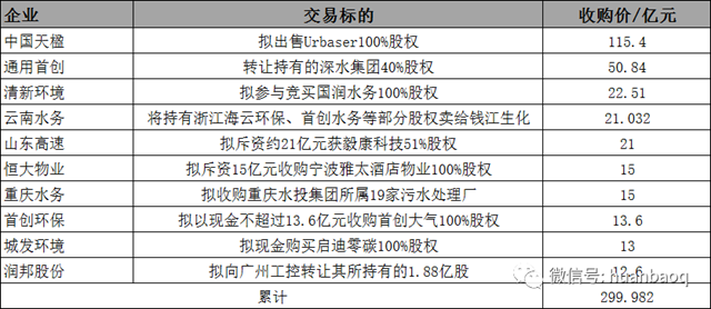 尤其值得一提的是,去年年度TOP 10并購案累計交易規(guī)模高達300億元,排名前三的,除了業(yè)內(nèi)熟知買來又賣的中國天楹出售Urbaser之外,還有兩樁鮮為人知的收購大案:通用首創(chuàng)50.84億元轉(zhuǎn)讓40%深水集團股權(quán),以及清新環(huán)境作價22.51億元競買國潤水務(wù)。