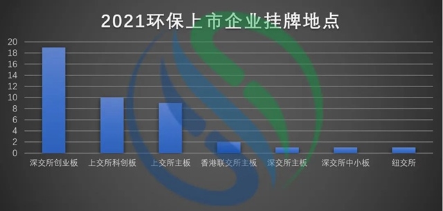 根據(jù)統(tǒng)計(jì)數(shù)據(jù)顯示,43家企業(yè)中,選擇在創(chuàng)業(yè)板上市的企業(yè)有19家,在科創(chuàng)板上市的企業(yè)有10家,在上交所主板上市的企業(yè)有9家,在香港聯(lián)交所主板上市的有2家,在深交所主板上市的有1家,在深交所中小板上市的1家,在紐交所上市1家。從2021年新增環(huán)保上市公司的上市渠道來看,實(shí)施股票注冊制的創(chuàng)業(yè)板與科創(chuàng)板已成為優(yōu)選上市板塊。