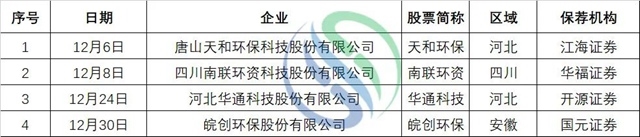 此外,目前還有美埃(中國)環(huán)境科技股份有限公司、華新綠源環(huán)保股份有限公司、湖南軍信環(huán)保股份有限公司、浙江天地環(huán)保科技股份有限公司、江蘇環(huán)保產(chǎn)業(yè)技術(shù)研究院股份公司、渤瑞環(huán)保股份有限公司等企業(yè)正在上市路上。