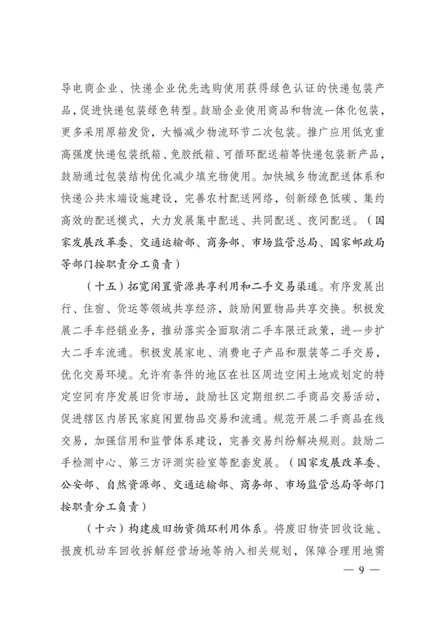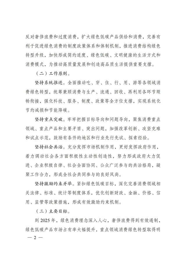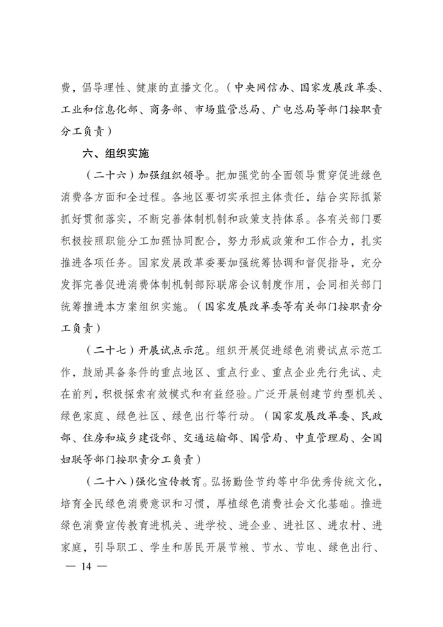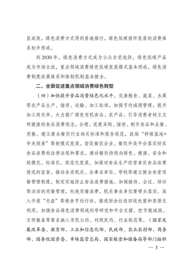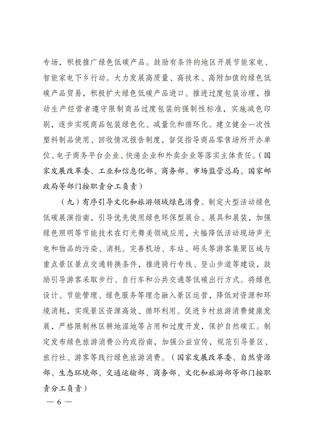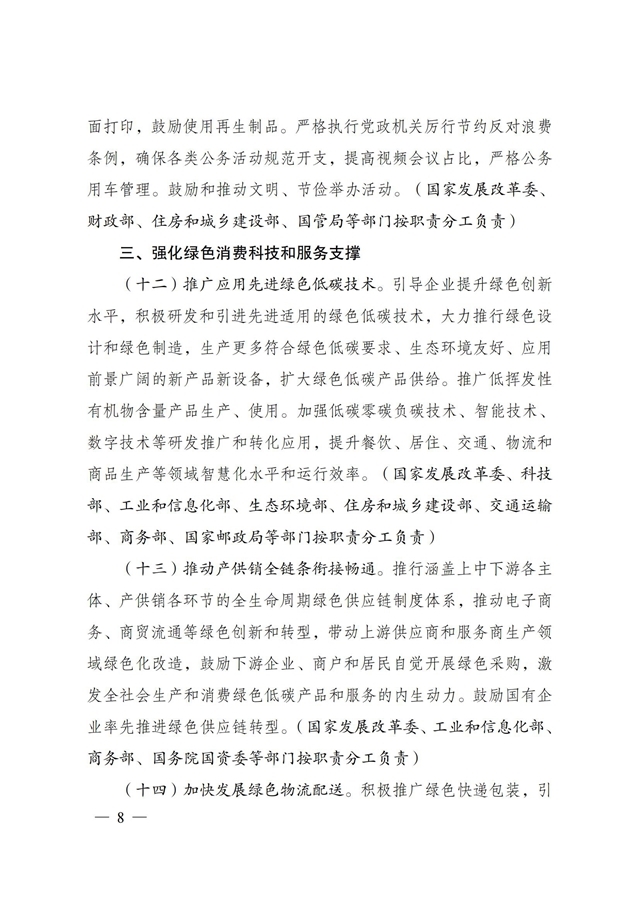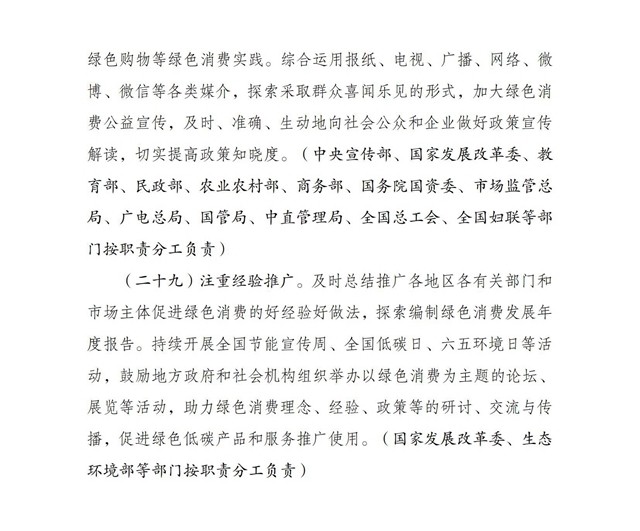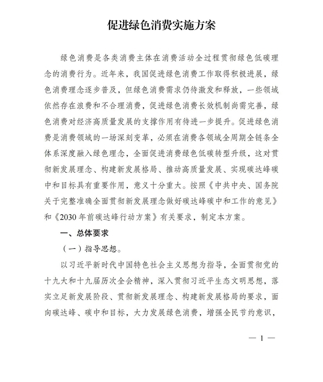 為深入貫徹落實《中共中央、國務院關于完整準確全面貫徹新發(fā)展理念做好碳達峰碳中和工作的意見》和《2030年前碳達峰行動方案》有關要求,根據(jù)碳達峰碳中和工作領導小組部署安排,國家發(fā)展改革委、工業(yè)和信息化部、住房和城鄉(xiāng)建設部、商務部、市場監(jiān)管總局、國管局、中直管理局會同有關部門研究制定了《促進綠色消費實施方案》。現(xiàn)印發(fā)給你們,請結合實際,認真抓好貫徹落實。