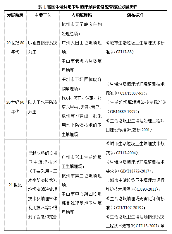 我國生活垃圾衛(wèi)生填埋技術(shù)主要經(jīng)歷了三個階段:20世紀(jì)80年代以垂直防滲為主的衛(wèi)生填埋場、20世紀(jì)90年代以水平防滲為主的衛(wèi)生填埋場、21世紀(jì)垃圾衛(wèi)生填埋技術(shù)、垃圾滲濾液處理技術(shù)及填埋氣體利用技術(shù)完善的衛(wèi)生填埋場,建設(shè)及配套標(biāo)準(zhǔn)見表1[1]。