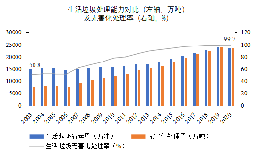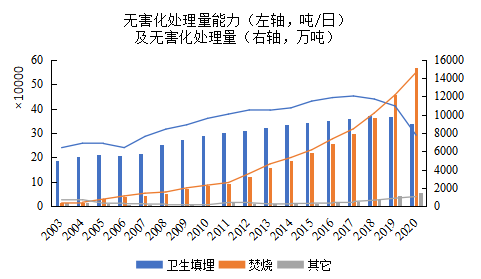 圖 1我國2003-2020年生活垃圾清運(yùn)量及無害化處理能力(數(shù)據(jù)來源:中國統(tǒng)計年鑒)