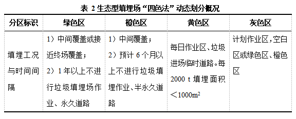 垃圾填埋場的生命周期主要分為三個階段:建設(shè)階段、運(yùn)行階段和封場修復(fù)階段。垃圾填埋場應(yīng)根據(jù)《生活垃圾衛(wèi)生填埋場處理工程項目建設(shè)標(biāo)準(zhǔn)》(建標(biāo)124-2009)建設(shè),建設(shè)項目主要包括填埋場主體工程與設(shè)備、配套工程和生產(chǎn)管理與輔助設(shè)施及生活服務(wù)設(shè)施等,建設(shè)完成后進(jìn)入運(yùn)行階段。衛(wèi)生填埋場運(yùn)行管理應(yīng)符合《生活垃圾填埋場運(yùn)行管理規(guī)范》(DB11/T 270-2014)。在運(yùn)行階段,生態(tài)型填埋場采用 “四色法”(國作登字-2020-L-01092309)對填埋場進(jìn)行動態(tài)劃分,即綠色區(qū)、黃色區(qū)、灰色區(qū)和橙色區(qū),詳見表2。