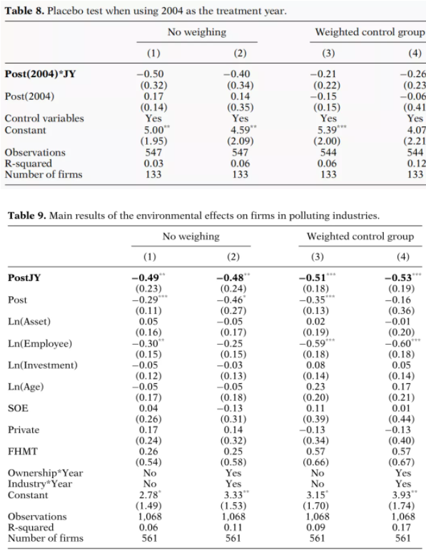 PostJY是本文最關(guān)心的變量,該變量的系數(shù)能夠刻畫江陰市綠色信貸政策的影響。表9顯示,該變量的系數(shù)負(fù)向顯著,由此可見(jiàn),該政策的實(shí)施使得江陰市顯著降低了污染排放強(qiáng)度。