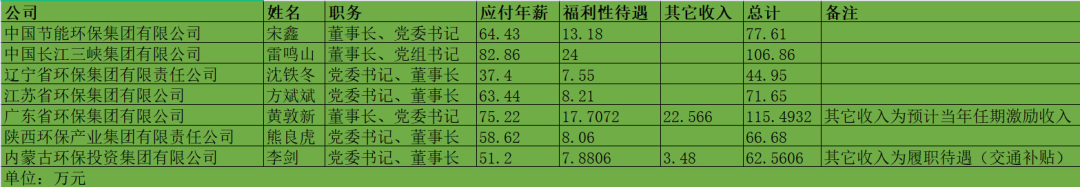 單看行業(yè)平均水平,大家感覺似乎有點悲觀,好像環(huán)保行業(yè)沒啥前途。不過,如果從高管薪酬水平來看,其實環(huán)保行業(yè)還是有不少收入較高的職位的。近日,國務院國資委和各地方國資委就公布了所屬企業(yè)負責人的薪酬情況,本文就給大家盤一盤環(huán)保行業(yè)高管的薪酬情況,看一看“國家隊”、地方環(huán)保集團,以及民企上市公司誰的薪酬水平更高?2021年的最后一天,國務院國資委發(fā)布《2020年度中央企業(yè)負責人薪酬披露》,公布了96家中央企業(yè)負責人的薪酬水平。其中,與環(huán)保行業(yè)有關的主要是兩家企業(yè),一家是中國節(jié)能環(huán)保集團有限公司(下稱“中節(jié)能”),另一家是中國長江三峽集團有限公司(下稱“三峽集團”)。兩家企業(yè),都是國家實施“長江大保護”戰(zhàn)略的平臺型公司,作用都非常重要。兩家企業(yè)中,三峽集團負責人的薪酬水平略高,董事長、黨組書記雷鳴山的應付年薪和福利性待遇(主要指社會保險、企業(yè)年金、補充醫(yī)療保險及住房公積金)總計達到106.86萬元,而中節(jié)能董事長、黨委書記宋鑫則為77.61萬元。看完“國家隊”的,再來看看地方環(huán)保集團的。在國務院國資委公布央企負責人薪酬水平的同時,各地方國資委也公布了2020年度省屬企業(yè)負責人的薪酬信息,北極星環(huán)保網專門整理了5家地方環(huán)保集團企業(yè)負責人的薪酬情況。這5家地方環(huán)保集團分別是:遼寧省環(huán)保集團有限責任公司、江蘇省環(huán)保集團有限公司、廣東省環(huán)保集團有限公司、陜西環(huán)保產業(yè)集團有限責任公司和內蒙古環(huán)保投資集團有限公司。5家企業(yè)中,企業(yè)負責人薪酬最高的是廣東省環(huán)保集團有限公司,其董事長、黨委書記黃敦新應付年薪為75.22萬元,福利性待遇17.7072萬元,另外還有22.5660萬元的預計當年任期激勵收入,合計一共是115.4932萬元。薪酬最低的,是遼寧省環(huán)保集團有限責任公司,黨委書記、董事長沈鐵冬應付年薪37.40萬元,福利性待遇7.55萬元,總計44.95萬元。其余3家企業(yè),負責人薪酬水平都差不太多,基本在60萬元-70萬元之間。全部看下來,可以看出,無論是“國家隊”還是地方環(huán)保集團,企業(yè)負責人的薪酬水平都不能算太高,超過100萬元的已屬于鳳毛麟角,大部分都在60萬元-70萬元左右。相對來說,南方企業(yè)總體來講比北方企業(yè)的薪酬水平要高一點。例如廣東、江蘇的地方環(huán)保集團,企業(yè)負責人薪酬就要比陜西、內蒙古高,而遼寧在已公布的幾個省份中則是最低。▼2家環(huán)保央企和5家地方環(huán)保集團企業(yè)負責人薪酬信息。制圖:環(huán)保圈看完環(huán)保行業(yè)央企和地方國資的高管薪酬情況,再來看看民企的。這方面,主要信息來源是各大環(huán)保上市公司的2020年的年報。具體的數據,《環(huán)保圈》去年曾經總結過,這里直接說結論。首先,我們統(tǒng)計了217位上市環(huán)保企業(yè)高管的薪酬水平,平均值是每人97萬元/年,接近“百萬元”吧。其次,雖然平均值達到了“百萬元”,但具體來看,每個人的情況差別還是很大的。最高的可以拿到625萬元,最低的則只有2.4萬元,足足相差了260倍。年薪最高的,是盈峰環(huán)境副總裁陳培亮,2020年年薪高達625萬元,可謂是環(huán)保領域的“最強打工人”。排名第二、第三的也是民企,他們分別是格林美的兩位高管——55歲的董事長許開華(587萬元/年)和62歲的常務副總王敏(312萬元/年)。此外,年薪在150萬元以上的還有:中持股份副總經理張翼飛、東江環(huán)保董事長譚侃、節(jié)能國禎創(chuàng)始人李煒、東方園林董事長劉偉杰、博天環(huán)境董事長趙笠鈞、瀚藍環(huán)境總經理金鐸、清新環(huán)境總裁李其林、維爾利董事長李月中等。可以看出,這些企業(yè)絕大多數都是民企(2020年時中持、國禎、博天等尚未完成“混改”)。▼年薪過200萬的13位上市環(huán)保企業(yè)高管2020年年薪最低的董事長是富春環(huán)保董事長萬嬌,只有2.5萬元,月平均工資約2000元。大家知道,富春環(huán)保是一家剛剛經歷了“混改”的企業(yè),2020年南昌市國資委剛剛入主,萬嬌則是由南昌國資提名,代替原董事長的人選。當然,民企高管的薪酬水平也并不一定都很高,也有偏少的。比如中國天楹,除總裁曹徳標年薪36萬元外,其余副總裁一律年薪25萬元,月工資2.1萬。總體來看,排名靠前、薪酬較高的企業(yè),絕大多數都是業(yè)績表現好,坐落于北上廣深的大型環(huán)保上市企業(yè),如盈峰環(huán)境、格林美、中持股份、首創(chuàng)股份、綠色動力、清新環(huán)境等。總體來看,“國家隊”、地方環(huán)保集團企業(yè)負責人的薪酬屬于中上水平,不是很高,但也不算太低。民企這邊,則呈現出“兩極分化”的狀態(tài),有特別高的,也有比較低的。但總體來講,收入最高的那些高管,基本上都來自于民企。以中持股份原總經理朱向東為例,2020年時,他還擔任中持股份的副總經理,年薪為155.4萬元。此外,他還擁有132.3萬股中持股份的股票,以今年1月12日的最新成交價(12.22元)計算,光是股票這部分價值就高達1616.7萬元。不過,去年年底,朱向東還是辭去了中持股份總經理一職,轉而擔任長江環(huán)保集團總經理的職務。或許,與民企相比,國企特別是長江環(hu