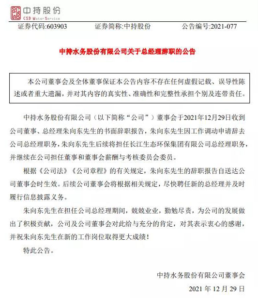 4、朱向東辭任中持股份總經理,將擔任長江環(huán)保集團總經理,全聯(lián)環(huán)境商會,2021-12-30
