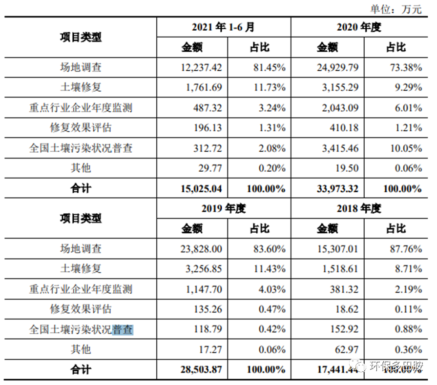 “報告期各期(2018-2021H1),公司土壤和地下水檢測業(yè)務(wù)收入分別為 17,441.44 萬元、28,503.87 萬元、33,973.32 萬元、15,025.04 萬元,占公司主營業(yè)務(wù)收入的比重分 別為 98.15%、95.69%、94.73%、91.81%。”