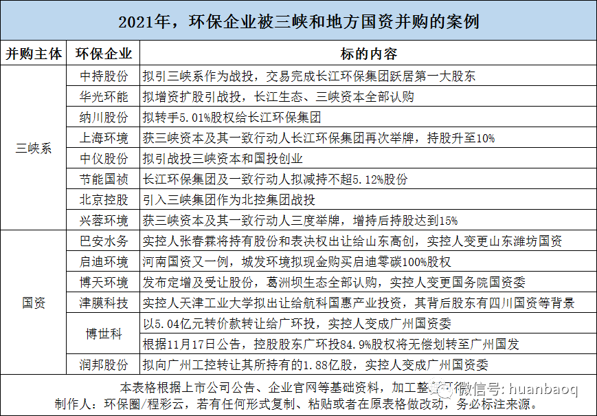 深:影響之深為近年來之最,去年發(fā)生的88起收并購,從某種意義上講已經(jīng)不是某些企業(yè)的戰(zhàn)略進(jìn)與退,也不是傳統(tǒng)行業(yè)跨界環(huán)保這樣簡單,它背后傳遞的信號有央企、國資、民企、外企四股力量的競爭更迭,也有行業(yè)最徹底洗牌、低負(fù)債對高負(fù)債的清算等,意味深遠(yuǎn)。并購頻率之多、交易金額之大,波及范圍之廣,產(chǎn)業(yè)影響之深,讓2021年環(huán)保產(chǎn)業(yè)收并購更加有看頭。在這一年里,我們不僅見證了世界級環(huán)保巨頭“老大并購老二”的一波三折,也領(lǐng)略了三峽、地方國資進(jìn)擊環(huán)保行業(yè)的“兇猛”,還看到了部分民企賣資產(chǎn),國資接盤“混改”大潮的落幕。從2020年8月,威立雅首次提出要收購蘇伊士股份起,直到2021年12月14日,歐盟委員會正式批準(zhǔn)二者收購交易,這場歷時1年零三個月,震驚環(huán)保圈的收購大案也進(jìn)入收尾階段。最終的收購價,威立雅同意以每股20.50歐元的價格收購蘇伊士股份,要比最初的每股15歐元的報價加價不少。(詳情查閱:威立雅蘇伊士簽署合并協(xié)議,“洋水務(wù)”劍指中國市場?)去年6月,中國天楹宣布要15億歐元(折合人民幣約115億元)出售Urbaser 100%股權(quán),9月底就走完了各項(xiàng)流程,10月中下旬就披露完成了所有交割事項(xiàng),速度非??欤z毫不拖泥帶水。對于這場收購案,媒體評價大都是正面,甚至有的還說中國天楹“里外躺贏”,在持有Urbaser的這些年中,中國天楹不僅在技術(shù)提升、產(chǎn)業(yè)鏈布局、海外業(yè)務(wù)、品牌影響力等方面獲益匪淺,而且通過買賣騰挪,中間除了掙了3.5億歐元投資差價之外,還把公司資產(chǎn)負(fù)債率,商譽(yù)減值風(fēng)險都降低了,簡直是人生贏家。(詳情查閱:中國天楹擬15億歐元出售Urbaser,賠了or賺了?)“一波三折”的城發(fā)環(huán)境換股吸收合并啟迪環(huán)境案,從去年年初一直持續(xù)到8月,才經(jīng)過河南省財政廳及河南省國資委正式批復(fù),中間較為突破的是6月份,城發(fā)環(huán)境宣布擬12.8億元并購啟迪環(huán)境相關(guān)資產(chǎn),其中擬定10億元收購鄭州啟迪零碳100%股權(quán),2.81億元收購武漢啟迪生態(tài)所持的5家下屬公司95%股權(quán)。帶著政治任務(wù)而來的三峽集團(tuán),近兩年不斷擴(kuò)大自己“朋友圈”,一旦被其看上,輕則舉牌增持股份,比如興蓉環(huán)境、上海環(huán)境就多次獲其增持;重則引入戰(zhàn)投,躍居大股東,比如中持,享受項(xiàng)目、訂單上的傾斜。據(jù)筆者不完全統(tǒng)計,2021年,三峽系通過三峽資本以及一致行動人長江生態(tài)環(huán)保集團(tuán),引戰(zhàn)投、舉牌增持上市環(huán)企高達(dá)8家,其中不僅有北控水務(wù)、上海環(huán)境、中持股份、興蓉環(huán)境等水務(wù)龍頭,還有華光環(huán)能、納川股份、中儀股份等細(xì)分領(lǐng)域的“強(qiáng)兵悍將”。最后的這個,不是某一家環(huán)保企業(yè),而是一類環(huán)保企業(yè)。從2018年起,環(huán)保行業(yè)的“混改潮”已經(jīng)持續(xù)了好幾年。本以為這場上市民企易主、國資混改的悲情大戲就要完結(jié)了,誰知去年還是斷斷續(xù)續(xù)有地方國資接盤上市民企案發(fā)生,兜兜轉(zhuǎn)轉(zhuǎn),博世科、巴安水務(wù)、博天環(huán)境、潤邦股份、啟迪環(huán)境終于在去年成功聯(lián)姻國資,抱上了金主大腿。▼圖五:三峽系和地方國資增持并購環(huán)保案例