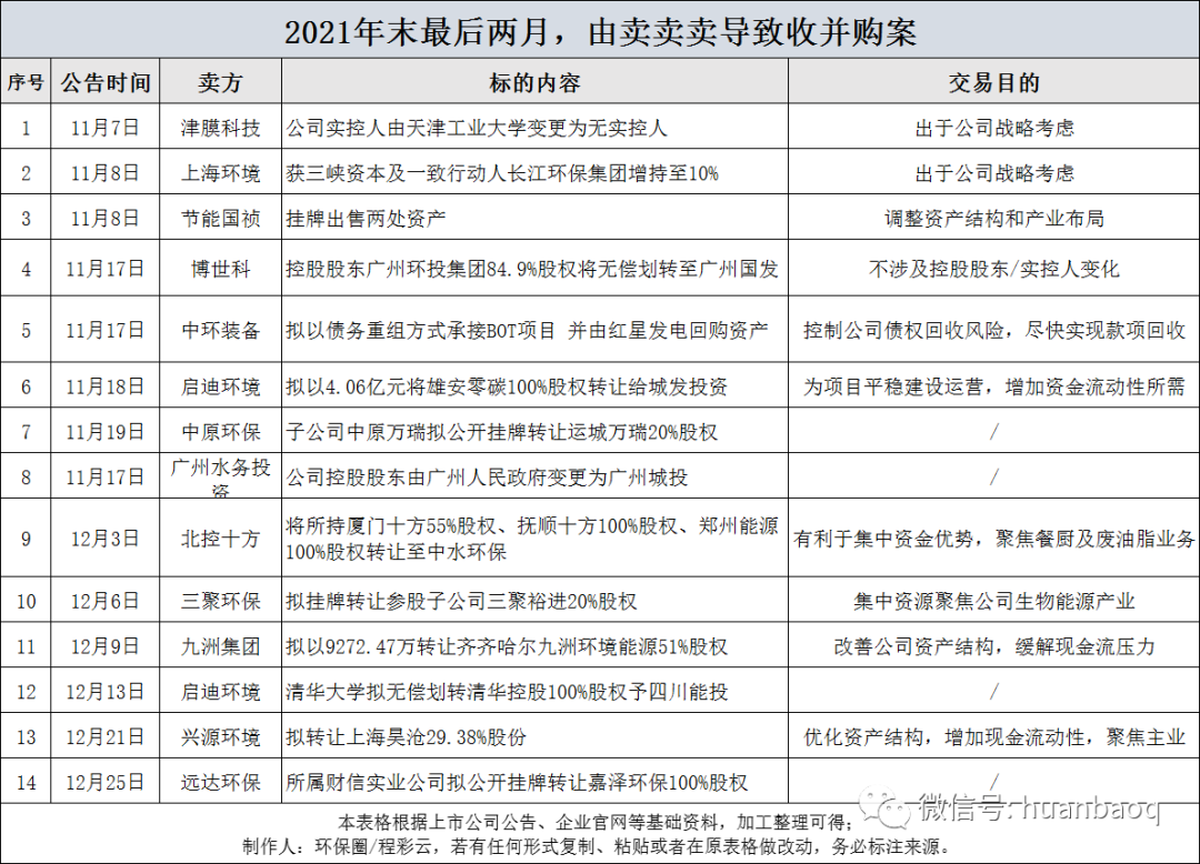 全:類型之全為近年來之最,不同于以往單一跨界并購或者延伸產(chǎn)業(yè)鏈,去年88起并購案交易類型更加全面。既有出于戰(zhàn)略考慮,完善產(chǎn)業(yè)鏈上下游,迅速占領(lǐng)某個地區(qū)市場的;也有極個別傳統(tǒng)產(chǎn)業(yè)跨界轉(zhuǎn)型而來,搶灘環(huán)保的(環(huán)衛(wèi)賽道尤其突出);還有像光大環(huán)境、城發(fā)環(huán)境、海天水務(wù)、高能環(huán)境等優(yōu)質(zhì)企業(yè),為了進(jìn)一步增厚原有項(xiàng)目規(guī)模,直接收購成熟運(yùn)營資產(chǎn)的。但更多的是,不少我們熟知的上市環(huán)企為了降低負(fù)債、保存實(shí)力“過冬”、緩解資金流動壓力,開始“賣賣賣”,小至某個污水處理廠、垃圾焚燒廠股權(quán)出售,大至整個公司實(shí)控人發(fā)生變更,年末最后兩月累計發(fā)生的26起并購交易案,其中“賣賣賣”占據(jù)一半,高達(dá)14起。▼圖四:年末最后兩月26起并購交易案,“賣賣賣”占據(jù)一半