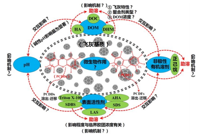 相關研究表明,溶解性有機物(DOM):如DOC(溶解性有機碳),DHM(溶解性腐殖類物質)和HA(腐殖酸類)等、pH、表面活性劑、非極性有機溶劑和微生物作用對飛灰中二噁英的溶出均有一定的影響。填埋處置環(huán)境中影響飛灰中PCDD/Fs溶出的主要因素及其相互作用關系如圖2所示。 圖2 填埋處置環(huán)境中影響飛灰中PCDD/Fs溶出的主要因素及其相互作用關系