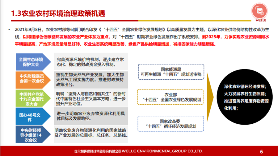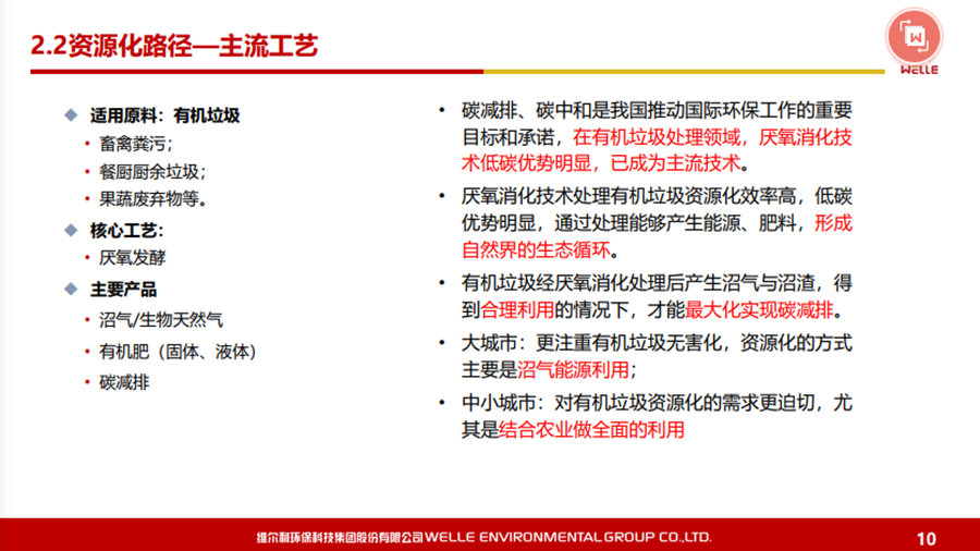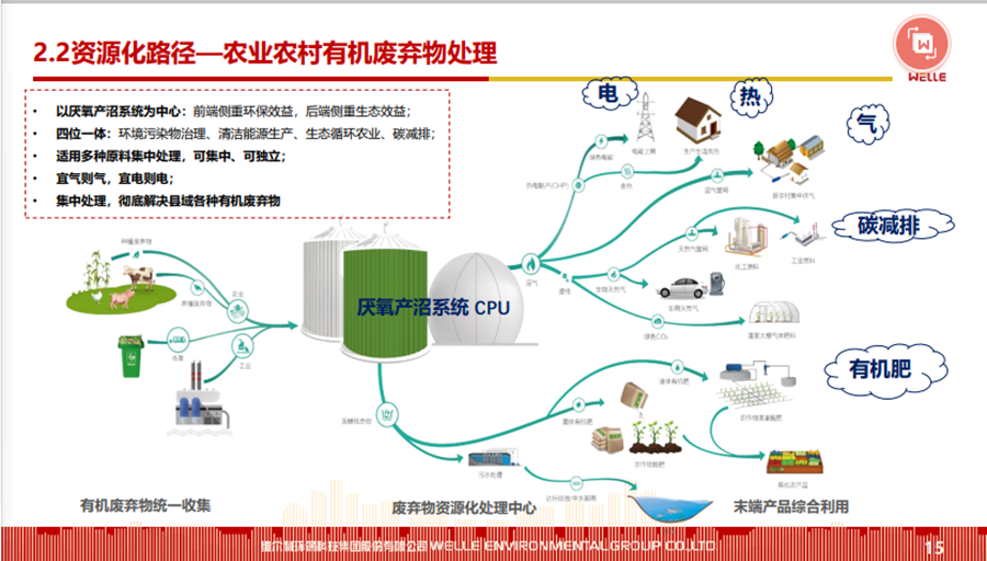 本文圍繞碳中和背景下的政策機遇、城鄉(xiāng)有機廢棄物資源化的的主要處理方法和路徑等內容展開,同時對維爾利集團概況和發(fā)展歷程做了簡要回顧。 2021年10月20-21日,2021年中國沼氣學會學術年會暨中德沼氣合作論壇在南京舉行。作為2021年中國沼氣學會學術年會的承辦單位,維爾利環(huán)??萍技瘓F股份有限公司董事長李月中博士以《城鄉(xiāng)有機廢棄物資源化路徑探討》為主題,與大家一起探討了碳中和背景下城鄉(xiāng)有機廢棄物資源化的發(fā)展與未來。報告圍繞碳中和背景下的政策機遇、城鄉(xiāng)有機廢棄物資源化的的主要處理方法和路徑等內容展開,同時對維爾利集團概況和發(fā)展歷程做了簡要回顧。本文根據(jù)其發(fā)言整理。▼維爾利環(huán)??萍技瘓F股份有限公司董事長 李月中今天有幸代表維爾利集團和大家做交流,作為會議的承辦方,也感謝中國沼氣學會、南京大學、德國沼氣協(xié)會給維爾利這個機會。維爾利作為專業(yè)的企業(yè),實際上歷史并不是很長,但是我們對沼氣和厭氧技術這塊有自己的獨到見解。作為一個商業(yè)機構,企業(yè)怎么能夠在競爭行業(yè)里生存和發(fā)展?在這里和大家做一些交流,和大家一起思考,同時希望在座的同仁能夠在這個行業(yè)相對比較困難的情況下抱團取暖。2020年9月,國家主席習近平在聯(lián)合國大會上提出“二氧化碳排放力爭于2030年前達到峰值,努力爭取2060年前實現(xiàn)碳中和”。2021年3月15日,習近平總書記主持召開中央財經委員會第九次會議并發(fā)表重要講話強調,要把碳達峰、碳中和納入生態(tài)文明建設整體布局,拿出抓鐵有痕的勁頭,如期實現(xiàn)2030年前碳達峰、2060年前碳中和的目標。從能源結構上來說,有機垃圾資源化產生的生物質能源在實現(xiàn)雙碳目標上具有獨特意義。這實際上也是倒推企業(yè)行業(yè)轉型。對大家來說,“碳達峰碳中和”既是一個挑戰(zhàn)也是一個機會。這里面包括了現(xiàn)在我們推出的對城市環(huán)境,對農村農業(yè)環(huán)境可能存在的機會,這些機會對環(huán)保產業(yè)來說,個人認為受到政策影響比較大。為什么德國2016年在農業(yè)生物天然氣領域有下滑?是因為某些政策出現(xiàn)了不到位的情況,一些企業(yè)就不愿意去做。在碳達峰、碳減排的前提下,我們有很多的機會,但這個機會要真正落實,還是要國家從頂層設計到具體的政策到位,才能夠使這個行業(yè)有比較好的發(fā)展。在城市環(huán)境治理領域,城市有機廢棄物(垃圾量)非常大。上海實施垃圾分類以后,2020年上海濕垃圾的產生量是每天在9500-10000噸左右,也就是說1/3為濕垃圾。這對焚燒廠來說,是一個巨大的減負,但同時對處理能力也有了條件限制。我們深度參與了這方面工作,現(xiàn)在上海的處理能力大概為4000噸左右,意味著上海的濕垃圾處理能力還有60%在建,徹底實現(xiàn)垃圾分類的路還很遠。北京情況更為嚴重。原來北京只有幾個堆肥廠,原來只是三相做一點小的堆肥,如果真的要實現(xiàn)垃圾源頭分類,大概4、5千噸的垃圾處理設施要重新建設。在農業(yè)農村環(huán)境治理領域,包括農產品加工這方面,整個市場規(guī)??赡芨?。各位前輩都已經做了一些介紹,我們是不是能夠全部實現(xiàn)資源化處理,是值得商榷的。對于不同的原料,我們應該怎么處理?作為企業(yè),我們推行起來還是有一定的難度。我們現(xiàn)在的這些大型的沼氣項目,它的源頭、原料、收益、收益成本,包括最終的產品出路,收集半徑到底多少是最合理的?實際上是需要根據(jù)不同有機廢棄物的種類以及最終產品的出路來規(guī)劃項目規(guī)模,而不是按照政策要求。比如一萬方的沼氣工程才稱得上大型沼氣項目,才有補貼,這樣的項目就不一定能夠真正地實現(xiàn)盈利。 下面大概講一講我們最近對城鄉(xiāng)有機廢棄物資源化的主要處理方法和路徑。