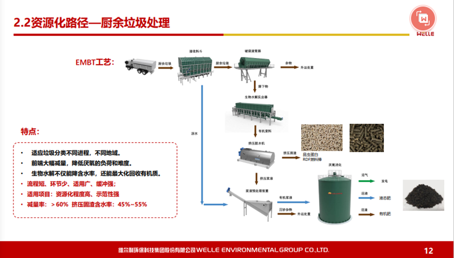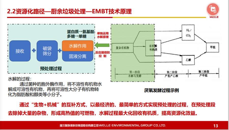 對于有機廢棄物的原料及核心技術,可以說從城市有機廢棄物到農村有機廢棄物,現(xiàn)在最核心的還是通過厭氧發(fā)酵技術,最終通過沼氣化利用,達到無害化或者是環(huán)?;?,再盡可能實現(xiàn)資源化。國家發(fā)改委推出了一百個餐廚垃圾處理試點項目,之后進行全方位地推出。在國內真正運行好的餐廚垃圾項目并不是特別多,主要工藝還是以厭氧為主。為什么這塊資源化的效率會好一些?尤其在“碳減排”的壓力下,使得出口價格一直比較好,這個行業(yè)最近稍微能夠掙點錢。另外,更深度的資源化利用,比如做有機質,食用的昆蟲養(yǎng)殖,也會有一些收益,再加上沼氣的收益。對于餐廚垃圾處理,我認為如果到了一定規(guī)模,收益還是不錯的。相對來說,廚余垃圾的資源化利用效率會差一些。現(xiàn)在全國都在推行垃圾分類,不同城市廚余垃圾的質量相差比較大。如上海的廚余垃圾含水率、油脂含量與餐廚垃圾是有一點類似的,含油量可能稍微小一點,但在其他城市就相差非常大。廚余垃圾資源化是節(jié)省能源化的利用,以無害化為主,有一些也可以做食用昆蟲的養(yǎng)殖。 對于濕垃圾或者是廚余垃圾,我們特別推出一款技術——EMBT技術。結合生物水解技術,原理是有機廢棄物或者有機物在厭氧發(fā)酵過程當中主要是通過酸化水解以及產甲烷兩個階段,我們通過設施化的反應器,把酸化水解在前面就能夠作為預處理,真正地溶解到水下面的有機物再到厭氧處理,這樣使得厭氧反應器不要那么復雜,剩下的固渣資源化也會比較方便,去做水量化的利用都是可行的。這個工藝現(xiàn)在在上海包括在紹興做下來,還是受到比較多的認可。