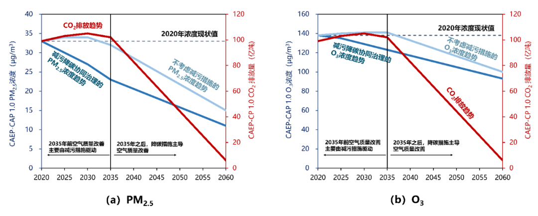 2.1 大氣環(huán)境治理與碳減排的協(xié)同路徑與思路我國(guó)大氣污染與 CO2 排放同根同源,具備協(xié)同治理的巨大潛力。從中長(zhǎng)期來(lái)看,應(yīng)科學(xué)研判不同歷史時(shí)期減污與降碳的主要驅(qū)動(dòng)力,系統(tǒng)謀劃協(xié)同減排路徑。從區(qū)域?qū)用鎭?lái)看,應(yīng)著重關(guān)注大氣污染嚴(yán)重的地區(qū),這些地區(qū)通常也是碳排放量大的區(qū)域。從行業(yè)和部門層面來(lái)看,重化工業(yè)、交通運(yùn)輸、民用等均是大氣污染物和 CO2 排放的主要來(lái)源,應(yīng)作為協(xié)同治理的重點(diǎn)予以關(guān)注。此外,推動(dòng)城市空氣質(zhì)量達(dá)標(biāo)和碳排放達(dá)峰“雙達(dá)”試點(diǎn)示范,探索典型城市實(shí)現(xiàn)“雙達(dá)”的主要路徑、關(guān)鍵措施、政策機(jī)制,也是有益嘗試。2.1.1 中長(zhǎng)期協(xié)同路線圖已有研究表明 [12, 13, 16],碳達(dá)峰碳中和目標(biāo)愿景對(duì)驅(qū)動(dòng)空氣質(zhì)量改善有巨大貢獻(xiàn)。如圖 3 所示,在碳達(dá)峰碳中和目標(biāo)的驅(qū)動(dòng)下,全國(guó) PM2.5年均濃度和 O3 濃度年評(píng)價(jià)值(日最大 8 小時(shí)濃度均值的第 90 百分位數(shù))有望在 2060 年左右達(dá)到世界衛(wèi)生組織 2005 版空氣質(zhì)量準(zhǔn)則值(PM2.5年均濃度小于 10 μg/m3,O3日最大 8 小時(shí)濃度均值小于 100 μg/m3),屆時(shí)降碳對(duì)減污(PM2.5)的累計(jì)貢獻(xiàn)將超過(guò) 80%[12]。在 2030 年實(shí)現(xiàn)碳達(dá)峰目標(biāo)之前,需要堅(jiān)持以美麗中國(guó)目標(biāo)和碳達(dá)峰目標(biāo)為雙牽引,持續(xù)強(qiáng)化大氣污染治理措施,特別是揮發(fā)性有機(jī)物(VOCs)排放相關(guān)的源頭替代等措施,實(shí)現(xiàn) PM2.5和 O3污染協(xié)同控制以及與碳減排的協(xié)同;這一階段,減污目標(biāo)將推動(dòng)中國(guó)獲得額外的降碳收益 [16]。2035 年以后,隨著大氣污染物末端治理技術(shù)進(jìn)一步減排的潛力逐步收窄,根本性的結(jié)構(gòu)調(diào)整等降碳措施將成為 CO2 與大氣污染物協(xié)同減排的核心牽引,降碳措施將主導(dǎo)減污的進(jìn)程[12,17]。