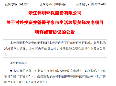 據(jù)悉,偉明環(huán)保作為聯(lián)合體牽頭人與上海寶達環(huán)境科技有限公司組成的聯(lián)合體于2022年1月被確認為該項目的中標社會資本。偉明環(huán)保負責投資、建設和運營平泉市生活垃圾焚燒發(fā)電特許經(jīng)營項目,公司以自有資金不超過 9,000 萬元投資于本項目。