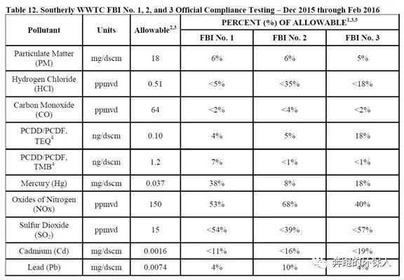 改造完成后,官方于2015年底至2016年出進(jìn)行了為期三個(gè)月的尾氣測(cè)試,最終結(jié)果顯示,經(jīng)過(guò)改造后,Southerly污泥焚燒廠的尾氣排放值完全滿足新標(biāo)準(zhǔn)中關(guān)于“已建流化床焚燒爐”尾氣排放的要求。下表數(shù)據(jù)中的百分?jǐn)?shù),表示實(shí)測(cè)濃度與排放限值的比例。