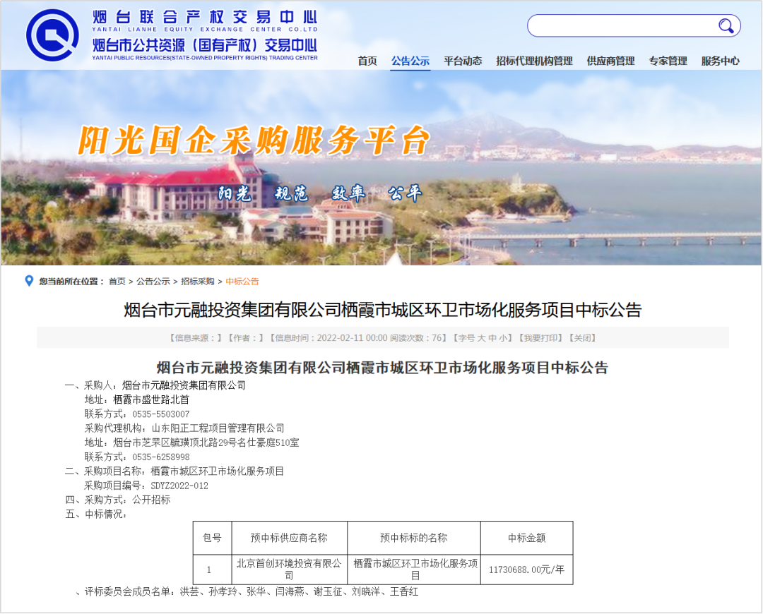 煙臺市公共資源(國有產(chǎn)權(quán))交易中心消息,2022年2月11日,煙臺市元融投資集團有限公司棲霞市城區(qū)環(huán)衛(wèi)市場化服務(wù)項目開標(biāo),中標(biāo)結(jié)果如下: