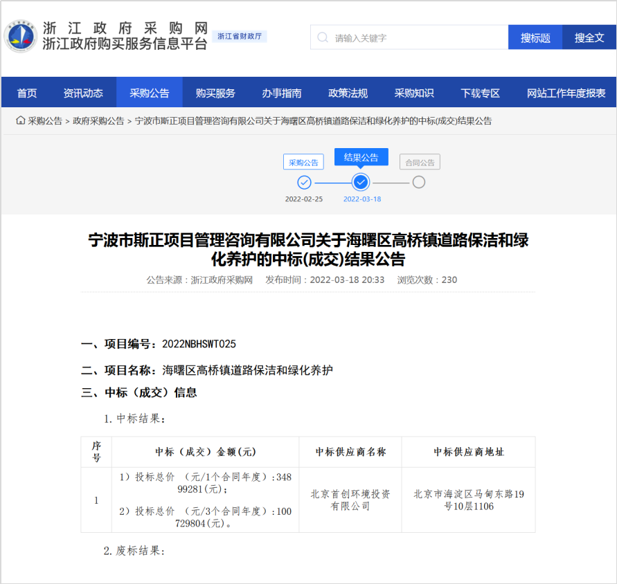 3月18日,浙江政府采購網(wǎng)發(fā)布寧波市海曙區(qū)高橋鎮(zhèn)道路保潔和綠化養(yǎng)護項目中標(biāo)公告,北京首創(chuàng)環(huán)境投資有限公司以10072.9804萬元/3年的投標(biāo)價格中標(biāo)該項目。 近日,首創(chuàng)環(huán)境在環(huán)衛(wèi)市場連下兩城,中標(biāo)金額約1.6億元。