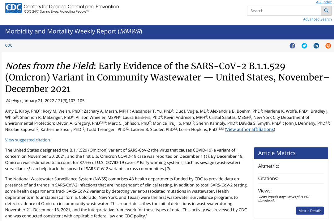 如今,新的一輪疫情卷土重來,污水處理行業(yè)再次面臨巨大的考驗。建議各地環(huán)保部門在加強監(jiān)管的同時,還要給予一定的幫助扶持,并在醫(yī)療廢水處理環(huán)節(jié)加強預處理,盡可能保證達標排放,從而避免對下游污水處理廠造成沖擊,減少污水處理環(huán)節(jié)的壓力。 進入3月,一場以“奧密克戎”為主的本土疫情在我國多地發(fā)生,范圍涉及吉林、福建、河北、廣東、遼寧、黑龍江、上海、天津、山東、湖南等多個省市。最新數(shù)據(jù)顯示,據(jù)國家衛(wèi)健委3月21日通報,3月20日0—24時,31個?。ㄗ灾螀^(qū)、直轄市)和新疆生產(chǎn)建設兵團報告新增確診病例2027例,其中境外輸入病例80例,本土病例1947例。這輪疫情最大的特點,就是傳播速度快、隱匿性強。相關研究顯示,奧密克戎毒株BA.1的傳播速度比德爾塔毒株快了77%,而奧密克戎毒株BA.2的傳播速度又比BA.1更快66%。受其影響,生活污水中新冠病毒的密度也出現(xiàn)大幅增加。污水處理相關從業(yè)人員應該注意做好防護,把奧密克戎病毒的影響降至最低點。2022年,是新冠疫情流行的第三年。春節(jié)過后,國內(nèi)已經(jīng)有多個地方報告感染者病例。在長春,3月11日,長春市疫情指揮部發(fā)布通知,要求停止一切非必要流動,全市小區(qū)、單位封閉式管理,學校停課,公共交通停運,機關居家辦公,企事業(yè)單位停止運營。當日,吉林省3月累報病例破千,吉林市、長春市兩地為集中點。此后4天,該省3月病例更是突破萬人。在浙江,自從3月3日以來,已經(jīng)發(fā)生了9起疫情,7起為獨立疫情,其中4起為境外輸入,5起與入境物品相關。在上海,3月20日,上海迪士尼度假區(qū)(包括上海迪士尼樂園、迪士尼小鎮(zhèn)和星愿公園)也宣布從3月21日起暫時關閉,恢復運營時間待定。在山東,青島、威海、淄博、德州等四地發(fā)生聚集性疫情,奧密克戎BA.1.1和BA.2同時流行,涉及學校、工廠等聚集場所。截至3月19日,該省已經(jīng)累計感染超過3000人。全國范圍看,據(jù)國家衛(wèi)生健康委網(wǎng)站3月21日通報,3月20日0—24時,31個?。ㄗ灾螀^(qū)、直轄市)和新疆生產(chǎn)建設兵團報告新增確診病例2027例,其中境外輸入病例80例,本土病例1947例。相比之前,這輪疫情最大的特點,就是傳播速度快、隱匿性強。據(jù)南京市衛(wèi)健委黨委書記、主任夏海鳴介紹,有研究顯示,奧密克戎毒株BA.1的傳播速度比德爾塔毒株快77%,BA.2的傳播速度又比BA.1快66%。“最嚴峻”“最復雜”——在吉林省、東莞市等地的官方發(fā)布中,都在以這樣的字樣來形容此輪疫情。山東省疾控中心傳染病防制所所長寇增強表示,自2020年以來,當?shù)嘏c新冠疫情打交道已經(jīng)超過2年,其間也處理過一定規(guī)模的本土聚集性疫情,但進入3月之后,“疫情形勢完全不一樣”。國家衛(wèi)健委新聞發(fā)言人米鋒也表示,當前,全球正在經(jīng)歷新冠疫情第四波流行高峰,連續(xù)十周每周報告新增病例均超過1000萬例,亞洲地區(qū)呈現(xiàn)快速上升態(tài)勢,我國周邊有關國家和地區(qū)不斷刷新單日新增病例最高紀錄,疫情傳入風險不斷加大。習近平總書記在3月17日召開的中共中央政治局常務委員會會議上強調(diào),堅持就是勝利。各地區(qū)各部門各方面要深刻認識當前國內(nèi)外疫情防控的復雜性、艱巨性、反復性,進一步動員起來,統(tǒng)一思想,堅定信心,堅持不懈,抓細抓實各項防疫工作。隨著新一輪疫情的反復,污水處理場所檢出的新冠病毒密度也開始大幅增加。據(jù)央視財經(jīng)3月17日報道,美國疾控中心在過去兩周內(nèi)對各地污水處理站進行檢測后公布的數(shù)據(jù)顯示,超過三分之一的污水處理點檢測出新冠病毒密度增加,其中有37%的漲幅在100%以上,有30%的漲幅超過1000%。在3月1日至3月10日期間,美國疾病控制與預防中心 (CDC)監(jiān)測的超過三分之一的廢水樣本點都顯示出新冠病毒呈上升趨勢。事實上,污水站的新冠病毒密度,已經(jīng)成為了新冠病毒傳播的一個早期預警信號。今年1月21日,美國疾病控制與預防中心 (CDC)曾經(jīng)發(fā)布過一份報告,其中指出,新冠病毒的變種奧密克戎(Omicron)很有可能在美國首例確診病例官宣的一周多前,就已經(jīng)存在于紐約市的廢水中了。據(jù)介紹,美國是在去年12月1日報告了美國首個奧密克戎病例。但CDC的樣品分析顯示,紐約市早在2021年11月21日就已經(jīng)有人感染了奧密克戎,這個時間比美國首例早了10天。▼美國CDC關于污水中發(fā)現(xiàn)新冠病毒變種的報告截圖 | 圖源:CDCCDC國家廢水監(jiān)測系統(tǒng)(NWSS)的項目負責人Amy Kirby對此表示:“廢水監(jiān)測真是一個非常強大的工具,它不僅是能為病毒傳播提供預警信號,還有助于跟蹤每波疫情的完整發(fā)展趨勢和軌跡。”正是由于生活污水中的新冠病毒含量與單日新增確診病例數(shù)呈現(xiàn)出“正相關”的關系,因此,近期美國多地污水站新冠病毒密度大幅上漲后,就有媒體和專家指出,這意味著美國新的疫情高峰可能即將到來。疫情卷土重來,污水處理廠站的一線工作人員感染風險也大幅上升,如何做好防護?相關研究顯示,2針mRNA疫苗或腺病毒載體疫苗對奧密克戎產(chǎn)生的中和抗體下降明顯(三針滅活對奧密克戎的中和能力待研究確認),原有疫苗接種方式效果大減。因此,接種加強針就成為了