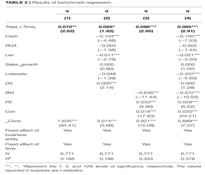 基準(zhǔn)回歸結(jié)果如下表所示,由回歸結(jié)果可知,無論是否加入控制變量,核心解釋變量的系數(shù)均顯著為正,表明綠色金融試點政策顯著提升了試點地區(qū)綠色企業(yè)的長期價值。