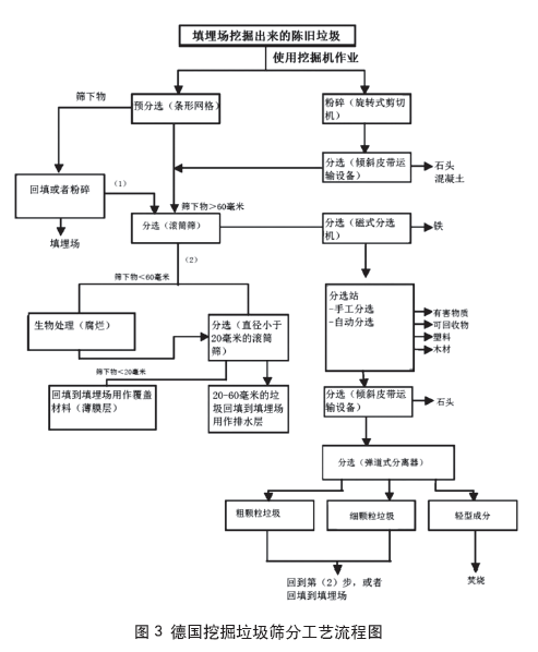 德國(guó)使用挖掘機(jī)對(duì)3米厚的覆土層的固體垃圾進(jìn)行開采。一般固體垃圾通過(guò)孔徑為60毫米的滾筒篩。大件垃圾在放置于滾筒篩上之前被粉碎。在滾筒篩之后,形成了粒度在0到60毫米之間的部分。用滾筒篩進(jìn)一步篩分,產(chǎn)生了粒度在0到20毫米之間的細(xì)顆粒垃圾和粒度在20到60毫米之間的部分。小于20毫米的細(xì)顆粒垃圾回填到填埋場(chǎng),用作覆蓋材料。20到60毫米的部分回填到填埋場(chǎng),用作填埋場(chǎng)的排水層。德國(guó)挖掘垃圾篩分工藝見(jiàn)圖3。