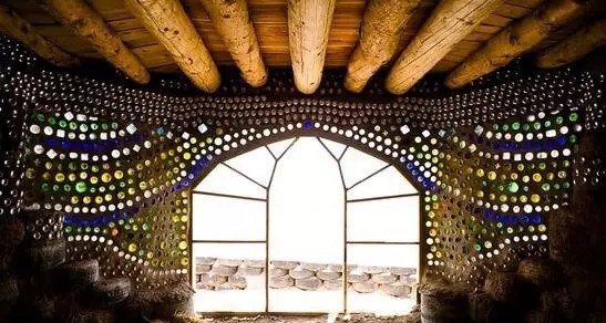 這是美國建筑師麥克·萊諾茲的作品。他的作品外形千奇百怪,而且都遵循著同一種理念:不需任何外接水電排污系統(tǒng),能夠自己發(fā)電,調(diào)溫,生產(chǎn)食物,收集循環(huán)用水;基本建材全是垃圾,廢棄輪胎、易拉罐、飲料瓶等。他給它們起了個名字:地球之舟Earthship。圖中的房子用輪胎和瓶子筑成的墻非常厚實(shí),足以抵抗九級地震。