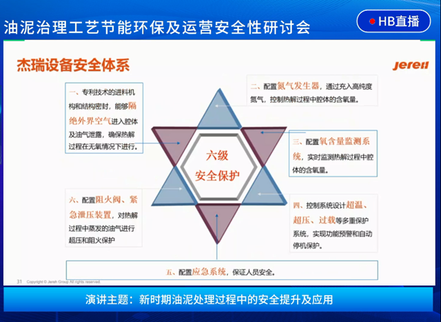 杰瑞設(shè)備“六級(jí)安全保護(hù)”系統(tǒng),從機(jī)械結(jié)構(gòu)密封、氮?dú)獍l(fā)生器、氧含量監(jiān)測(cè)系統(tǒng)、功能預(yù)警和停機(jī)保護(hù)系統(tǒng)、應(yīng)急系統(tǒng)到阻火閥與緊急泄壓裝置,通過多種技術(shù)手段構(gòu)建起層層防護(hù),來為油泥處理的安全性把關(guān)。