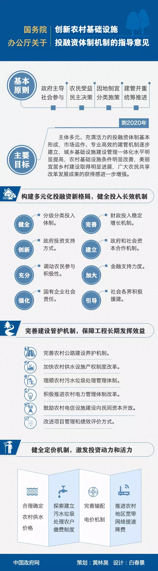(二)基本原則。政府主導(dǎo)、社會(huì)參與。明確農(nóng)村基礎(chǔ)設(shè)施的公共產(chǎn)品定位,強(qiáng)化政府投入和主導(dǎo)責(zé)任,加強(qiáng)城鄉(xiāng)基礎(chǔ)設(shè)施統(tǒng)籌規(guī)劃,加大政策支持力度。破除體制機(jī)制障礙,引導(dǎo)和鼓勵(lì)社會(huì)資本投向農(nóng)村基礎(chǔ)設(shè)施領(lǐng)域,提高建設(shè)和管護(hù)市場(chǎng)化、專業(yè)化程度。