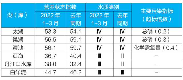 1-3月,監(jiān)測的192個重點湖(庫)中,水質(zhì)優(yōu)良(Ⅰ——Ⅲ類)湖庫個數(shù)占比78.1%,同比上升2.7個百分點;劣Ⅴ類水質(zhì)湖庫個數(shù)占比4.7%,同比上升1.0個百分點。主要污染指標為總磷、化學需氧量和高錳酸鹽指數(shù)。176個監(jiān)測營養(yǎng)狀態(tài)的湖(庫)中,中度富營養(yǎng)8個,占4.5%;輕度富營養(yǎng)32個,占18.2%;其余湖(庫)為中營養(yǎng)或貧營養(yǎng)狀態(tài)。其中,太湖和巢湖均為輕度污染、輕度富營養(yǎng),主要污染指標為總磷;滇池為輕度污染、輕度富營養(yǎng),主要污染指標為化學需氧量;洱海、丹江口水庫和白洋淀水質(zhì)均良好、中營養(yǎng)。