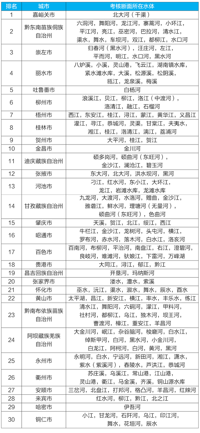 水環(huán)境質(zhì)量狀況排名前30位城市及所在水體