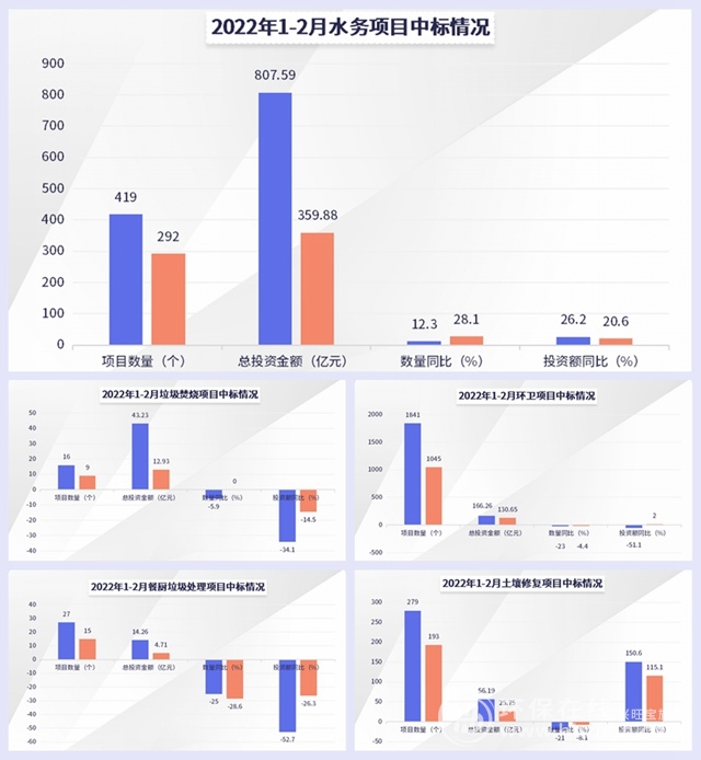 從上述圖表來(lái)看,2022年前兩個(gè)月,環(huán)衛(wèi)中標(biāo)項(xiàng)目最多,水務(wù)中標(biāo)金額最大,餐廚垃圾的同比下滑最多,土壤修復(fù)2個(gè)月的投資額同比增幅均超過(guò)了110%,1月更是達(dá)到了150.6%,而同時(shí)中標(biāo)數(shù)量卻是下降的,堪稱“完美逆襲”。