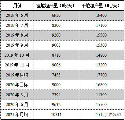 據(jù)上海市綠化市容局公布的數(shù)據(jù)顯示(表1所示),2019年7月,上海廚余(濕)垃圾分出量達到8200噸/天,較2018年年底增長了110%。2020年6月,上海廚余垃圾分出量達到9632噸/天,較2019年同期增長近40%,2021年濕垃圾產(chǎn)量平均已經(jīng)超過1萬噸/日,分類成效遠遠走在國內(nèi)前端。預(yù)計上海廚余垃圾分出總量的峰值可以達到11300噸/天,其中家庭廚余占6800噸/天,餐廚垃圾3000噸/天,其他濕垃圾1500噸/天。
