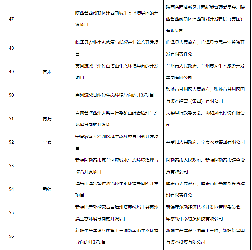 同時(shí),對于第二批試點(diǎn),3部門還提出了4點(diǎn)要求。?1、認(rèn)真貫徹國家有關(guān)生態(tài)環(huán)境治理模式創(chuàng)新和環(huán)保產(chǎn)業(yè)發(fā)展要求在試點(diǎn)工作開展過程中積極探索,創(chuàng)新生態(tài)環(huán)境治理項(xiàng)目組織實(shí)施方式,促進(jìn)生態(tài)環(huán)境高水平保護(hù)和區(qū)域經(jīng)濟(jì)高質(zhì)量發(fā)展。省級生態(tài)環(huán)境、發(fā)展改革部門等試點(diǎn)推進(jìn)單位加強(qiáng)對試點(diǎn)工作的督促指導(dǎo),對試點(diǎn)工作中發(fā)現(xiàn)的問題要及時(shí)予以糾正,推進(jìn)試點(diǎn)工作規(guī)范實(shí)施。國家開發(fā)銀行有關(guān)分行對符合條件的試點(diǎn)項(xiàng)目,按照精準(zhǔn)施策、市場化運(yùn)作和風(fēng)險(xiǎn)可控原則,發(fā)揮開發(fā)性金融大額中長期資金優(yōu)勢,統(tǒng)籌考慮經(jīng)濟(jì)效益和環(huán)境效益,在資源配置上予以傾斜,加大支持力度。也就是說,省級環(huán)保部門和發(fā)改部門要加強(qiáng)指導(dǎo)監(jiān)督,而國開行有關(guān)分行則要在資源分配上予以傾斜,加大支持。試點(diǎn)實(shí)施單位是試點(diǎn)工作的責(zé)任主體,要嚴(yán)格履行試點(diǎn)實(shí)施承諾,不以試點(diǎn)名義突破現(xiàn)有法律法規(guī)政策等要求,嚴(yán)格落實(shí)招投標(biāo)、政府采購、投融資、土地、資源開發(fā)、空間管控、資產(chǎn)處置等各項(xiàng)法規(guī)政策,不以任何形式增加地方政府隱性債務(wù)。采用合法合規(guī)方式選擇具備較強(qiáng)產(chǎn)業(yè)投資運(yùn)營能力的項(xiàng)目實(shí)施主體,由一個(gè)主體一體化實(shí)施,確保產(chǎn)業(yè)開發(fā)項(xiàng)目持續(xù)運(yùn)營。這一條,是有關(guān)風(fēng)險(xiǎn)防范的條款,告知試點(diǎn)實(shí)施單位要注意控制政府隱性債務(wù),依法開展試點(diǎn)。?3、強(qiáng)化項(xiàng)目收益內(nèi)部反哺機(jī)制試點(diǎn)實(shí)施單位切實(shí)加強(qiáng)公益性生態(tài)環(huán)境治理項(xiàng)目與相關(guān)經(jīng)營性產(chǎn)業(yè)開發(fā)項(xiàng)目一體化融合實(shí)施。在項(xiàng)目邊界范圍內(nèi)實(shí)現(xiàn)產(chǎn)業(yè)開發(fā)項(xiàng)目對生態(tài)環(huán)境治理項(xiàng)目建設(shè)與運(yùn)營的持續(xù)性收益反哺。實(shí)施中可適當(dāng)優(yōu)化試點(diǎn)依托項(xiàng)目,加強(qiáng)產(chǎn)業(yè)收益對生態(tài)環(huán)境治理的反哺力度,減少政府資金投入,力爭實(shí)現(xiàn)政府資金“零投入”。大家知道,EOD項(xiàng)目都是“肥瘦搭配”,這一條就是要求“肥”項(xiàng)目要加強(qiáng)反哺“瘦”項(xiàng)目,從而減少政府資金投入,最好是實(shí)現(xiàn)政府資金“零投入”,應(yīng)該說這才是EOD模式的“初心”。試點(diǎn)實(shí)施單位加強(qiáng)統(tǒng)籌,及時(shí)總結(jié)經(jīng)驗(yàn)做法,探索形成可復(fù)制、可推廣的生態(tài)環(huán)境治理創(chuàng)新模式。按照《關(guān)于開展生態(tài)環(huán)境導(dǎo)向的開發(fā)模式試點(diǎn)定期調(diào)度的通知》要求,試點(diǎn)實(shí)施單位于每季度首月10日前將試點(diǎn)項(xiàng)目季度實(shí)施進(jìn)度情況表報(bào)送生態(tài)環(huán)境部科技與財(cái)務(wù)司。試點(diǎn)期內(nèi)每年12月底前將年度進(jìn)展情況報(bào)告報(bào)請省級生態(tài)環(huán)境、發(fā)展改革部門審查后,由兩部門上報(bào)生態(tài)環(huán)境部、國家發(fā)展改革委,抄報(bào)國家開發(fā)銀行。既然是試點(diǎn),最重要的任務(wù)肯定就是摸索經(jīng)驗(yàn)、探索模式,從而有利于以后的推廣,這一條就是關(guān)于這方面的規(guī)定。總的來看,第二批EOD模式試點(diǎn),國家的要求并不算很多,還是以探索為主,希望能夠形成可復(fù)制、可推廣的經(jīng)驗(yàn)。所以入選項(xiàng)目也可以盡可能地放開手腳,大膽試驗(yàn)。第一批試點(diǎn)授信額度達(dá)644億元