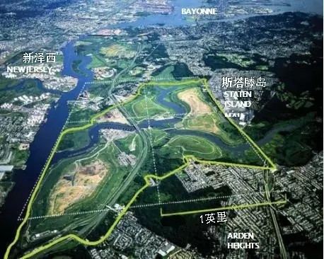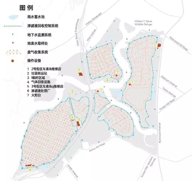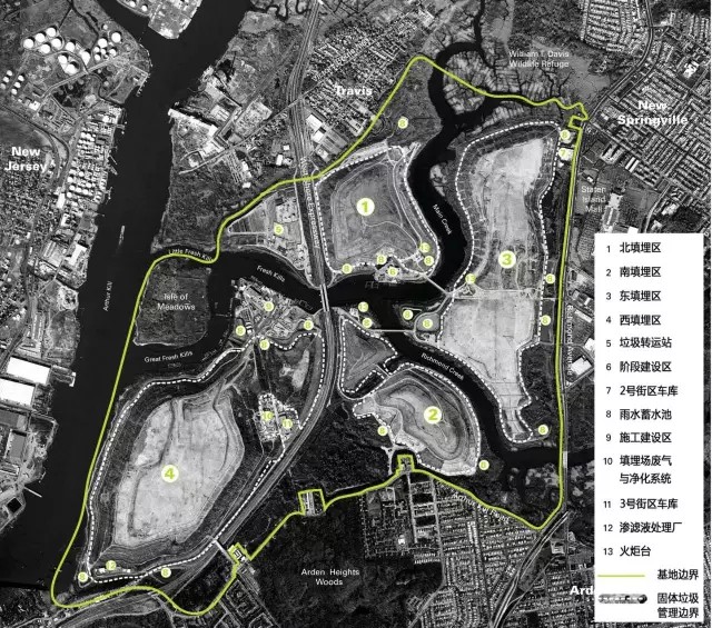 弗萊士河垃圾填埋場(chǎng)位于紐約斯塔滕島(圖3),占地面積超過2200英畝(約8.9k㎡),于1948年投入運(yùn)營(yíng),2001年停止接收垃圾。這里曾經(jīng)是世界上最大的垃圾填埋場(chǎng),也是1990年代紐約市唯一仍在使用的填埋場(chǎng)。隨著1999年弗萊士河更新計(jì)劃的啟動(dòng),原有填埋場(chǎng)區(qū)陸續(xù)關(guān)閉并封場(chǎng),直至2001年,填埋場(chǎng)接收了最后一批垃圾——“9?11”事件的世貿(mào)中心建筑廢墟。