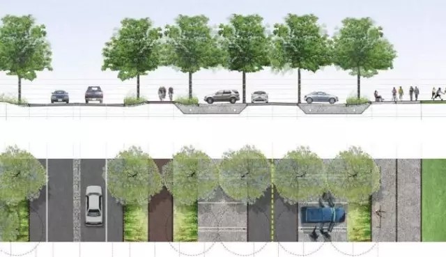 盡管公共交通是公園所在的斯塔滕島鼓勵(lì)發(fā)展的交通方式,但在以小汽車為主導(dǎo)的美國(guó)城市,短時(shí)間內(nèi)轉(zhuǎn)變主要交通方式的可行性較低。因此,公園規(guī)劃包含了適應(yīng)自然環(huán)境的停車設(shè)施規(guī)劃(圖9)。停車場(chǎng)分散于公園內(nèi)的各個(gè)主要片區(qū),掩映在線性栽植的樹蔭下,并與停車場(chǎng)周圍的自然環(huán)境相融合。停車場(chǎng)以可滲透性材料鋪設(shè),以減低熱島效應(yīng),并控制地表徑流(圖10)。
