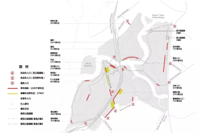 (5)在生態(tài)敏感度允許條件下優(yōu)化交通網(wǎng)絡(luò),提升公園在紐約市域及區(qū)域范圍內(nèi)的可達(dá)性;
