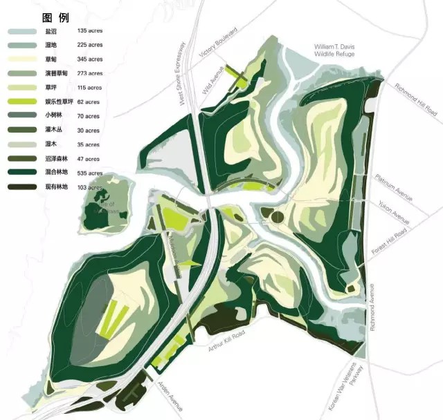在1948年垃圾填埋場(chǎng)運(yùn)營(yíng)之前,弗萊士河區(qū)域是哈德遜河河口最大的濕地之一,50多年的垃圾填埋對(duì)生態(tài)造成了嚴(yán)重的影響。公園總體規(guī)劃旨在恢復(fù)基地原有的生態(tài)風(fēng)貌與動(dòng)植物棲息地,并設(shè)立了五個(gè)主要目標(biāo):