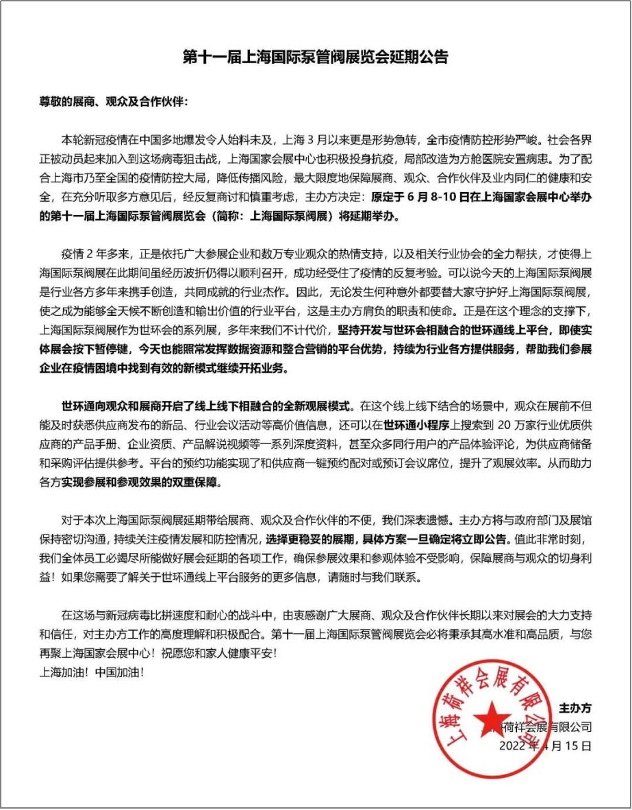 本輪疫情在中國(guó)多地爆發(fā)令人始料未及,上海3月以來(lái)更是形勢(shì)急轉(zhuǎn),全市疫情防控形勢(shì)嚴(yán)峻。社會(huì)各界正被動(dòng)員起來(lái)加入到這場(chǎng)病毒狙擊戰(zhàn),上海國(guó)家會(huì)展中心也積極投身抗疫,局部改造為方艙醫(yī)院安置病患。為了配合上海市乃至全國(guó)的疫情防控大局,降低傳播風(fēng)險(xiǎn),最大限度地保障展商、觀眾、合作伙伴及業(yè)內(nèi)同仁的健康和安全,在充分聽(tīng)取多方意見(jiàn)后,經(jīng)反復(fù)商討和慎重考慮,上海國(guó)際泵閥展主辦方?jīng)Q定:原定于6月8-10日在上海國(guó)家會(huì)展中心舉辦的第十一屆上海國(guó)際泵管閥展覽會(huì)(簡(jiǎn)稱:上海國(guó)際泵閥展)將延期舉辦。
