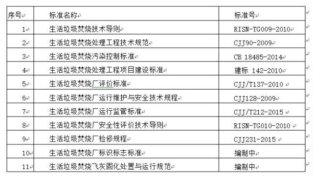 下表為近年來關(guān)于生活垃圾清潔焚燒標準和評價體系的標準規(guī)范等。